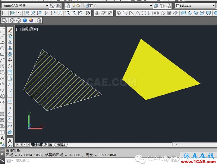 3.输入“aa”命令---空格-----“O”命令---空格---点击填充部分或形成的面域命令行那里会自动显示面积和周长如下图所示为同一个图形分别为图案填充和面域分别测量出来的数值