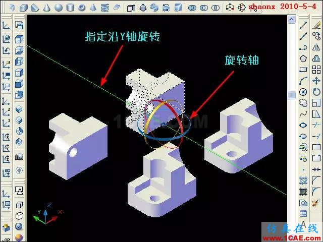 操作:点击“三维旋转”命令按钮,选中右后面的实体,指定旋转基点,如下图: