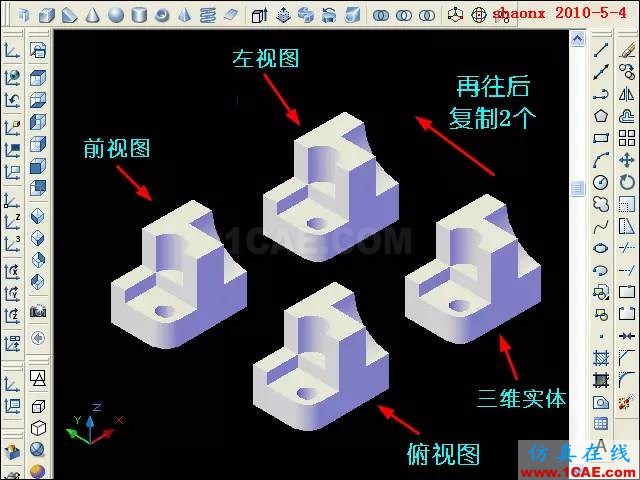 2、按照刚才的三个视图的定位,以前视图的方向为基准,用“复制”命令,将三维实体往左边复制一个,