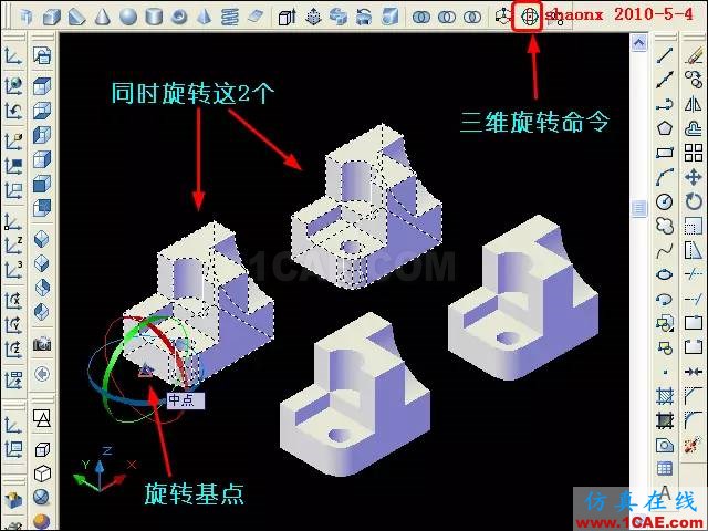 操作:点击“三维旋转”命令按钮,选中后面2个实体,指定旋转基点,如下图:
