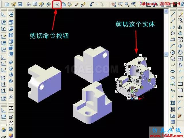 10、选中右前面这个实体,点击“标准”工具条上的“剪切”命令按钮(或CTRL+X)。