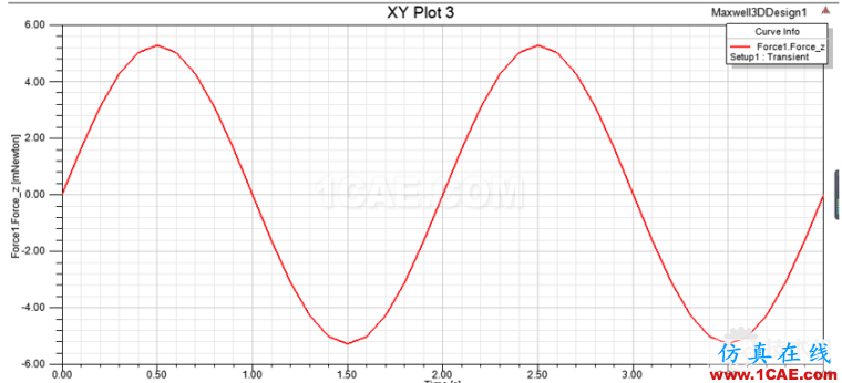 同理在category中选force, quantity中选Fore1.force_z显示出圆柱导体Z向分力曲线如下图。