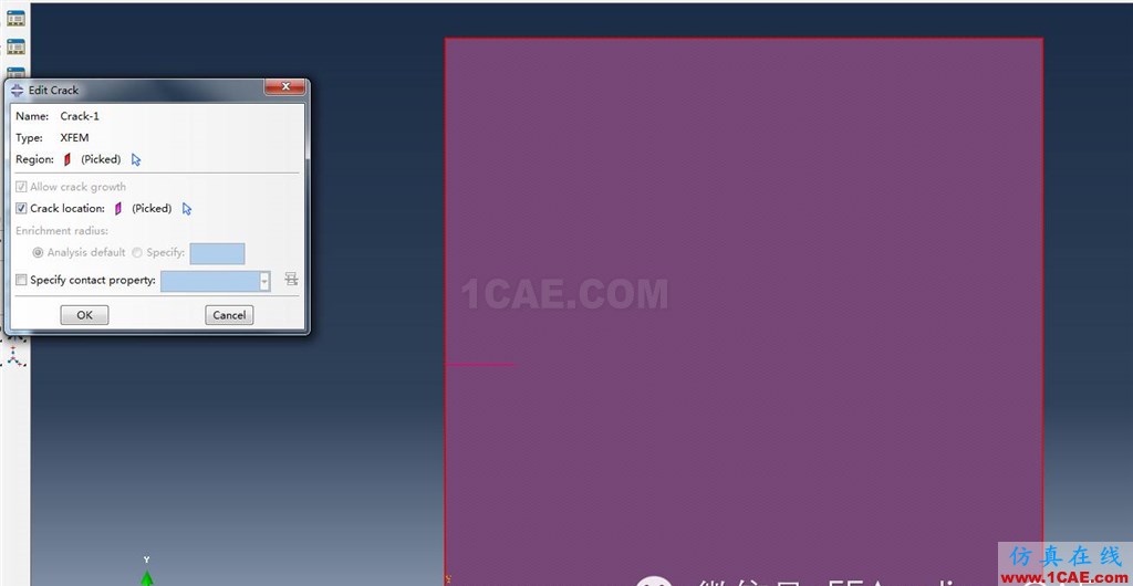 点击Create Interaction,选择初始分析步,类型选择XFEM crack growth。Ok确认,裂纹就定义完成了。