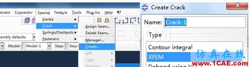 选择Special > Crack > Creat来创建裂纹,在弹出的菜单中选择使用XFEM的方式,并给裂纹命名。