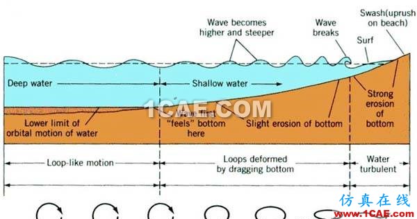 深水波:深水波是指水深大于半个波长处的波浪。其水面附近的水质点运动比较显著,水质点运动近似为一圆形,而波动随深度的增加而逐渐微弱甚至静止。其传播速度只取决于波长,而与水的深度无关。
