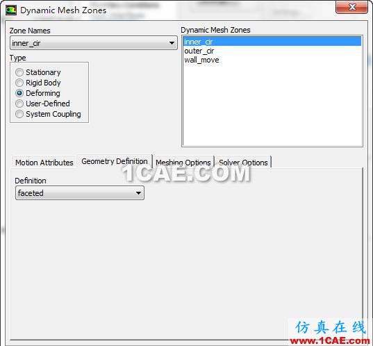 (2)例子中使用DEFINE_GEOM宏描述小圆和大圆的运动。其实在新版本的FLUENT中是不必要的。只需要指定其Definition为faceted即可。