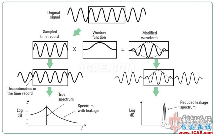 FFT变换后,IQ分析仪在做频谱显示时,需要加窗,这一点我们可以用图二加以说明。
