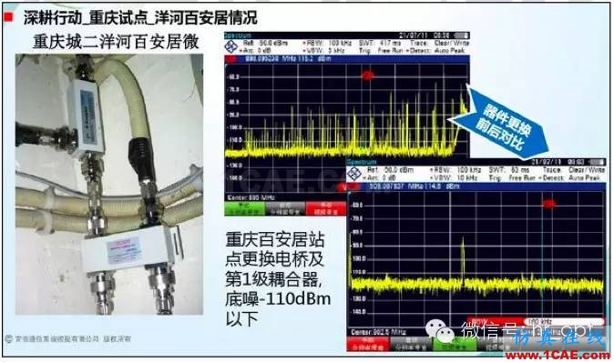 说明:线路中的器件也是参生互调信号的重灾区,所以一般的天线, 馈线,器件都需要进行互调检测。图上就是更换问题器件后可以看出干扰信号降低很多(波峰大幅减少)。