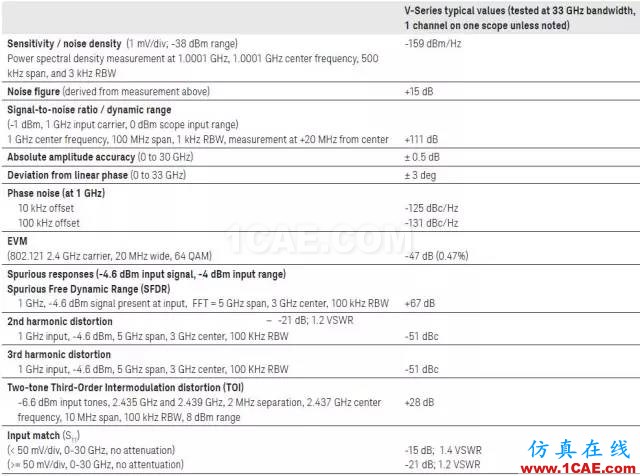 而且,为了满足射频测试的要求,现代的高性能示波器里除了传统的时域指标以外,也开始标注射频指标以适应射频用户的使用习惯。下表就是Keysight公司V系列示波器里给出的典型的射频指标。