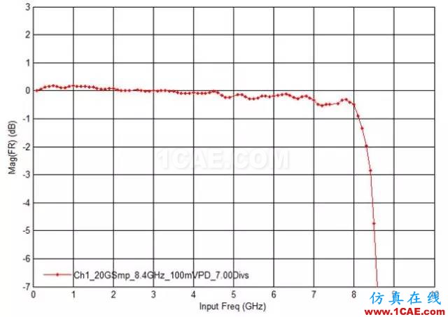 至于幅频响应,传统上宽带设备的幅频响应都不会特别好,但现代的高性能示波器在出厂时都会做频率响应的校准和补偿,使得其幅频响应曲线非常平坦。下图是Keysight公司8GHz带宽的S系列示波器的幅频响应曲线,可以看出其带内平坦度非常好,在7.5GHz以内的波动不超过±0.5dB。