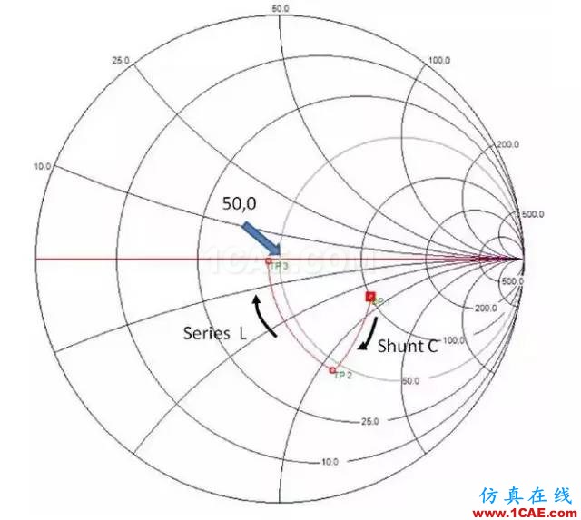 1.将一个8.2pF大小的电容与天线串联起来。在所需频带内,该电容的阻抗为0Ω。该阻抗便是天线阻抗。天线的阻抗等于(100.36–j34.82),如Smith图表中红色圆圈所示。
