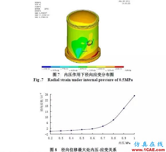 计算结果表明,增大内压后,筒体径向应变超过开裂应变的区域分布在筒体底部设
