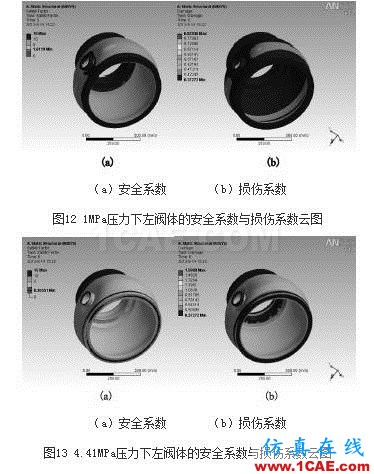 在给定阀门设计使用寿命为5000次的基础上,分别计算1MPa与4.41MPa下左阀体的安全系数及损伤系数(图12,图13)。图12中,1MPa压力左阀体安全系数最小为1.6119,大于1。损伤系数最大为0.8203,小于1。说明阀门在寿命期限内时,流体系统在1MPa压力使用条件下,安全系数和损伤系数均在合理范围之内,阀门左阀体是安全的。图13中,4.41MPa压力左阀体安全系数最小为0.3655,小于1。损伤系数最大为1.5988,大于1。说明阀门在4.41MPa的工作压力下是不安全的。
