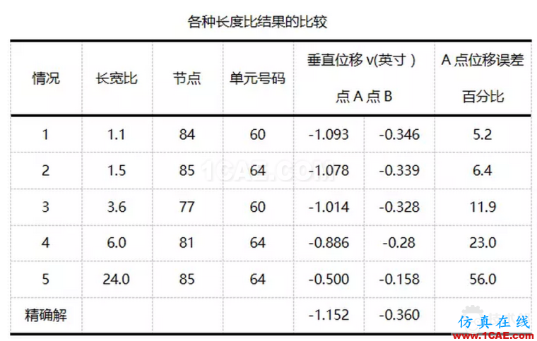 我们先考虑第一行,它是第一种单元划分情况,此时每个单元的长宽比是1.1,由此我们计算出A点,B点的垂直位移,可以看到,A点的竖直位移是-1.093英寸,而B点的竖直位移是-0.346英寸。而这两点我们都是可以用弹性力学的方式得到精确解的,其精确解分别是-1.152以及-0.360.这样,我们可以得到此时A点位移误差的百分比是[(-1.093)-(-1.152)] / 1.152 = 5.2%.