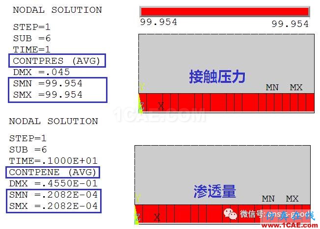 下图是上下板之间的接触压力为99.954 MPa,渗透量为0.2084e-4 mm。
