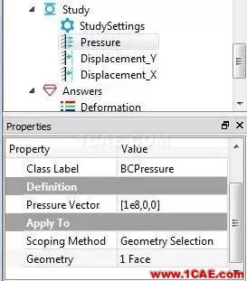 1) 在工具栏中点击“Add Pressure”按钮,在其属性窗口中设置施加的面,压力大小,和方向。这里我们在X方向上给与 1e8的拉力。施加压力后图形会以高亮和文字显示出来。