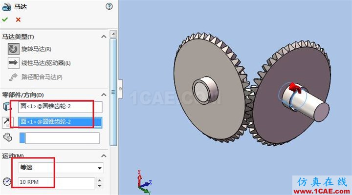 添加一个逆时针等速旋转马达,转速为10r/min,马达位置位于齿轮轴孔处。