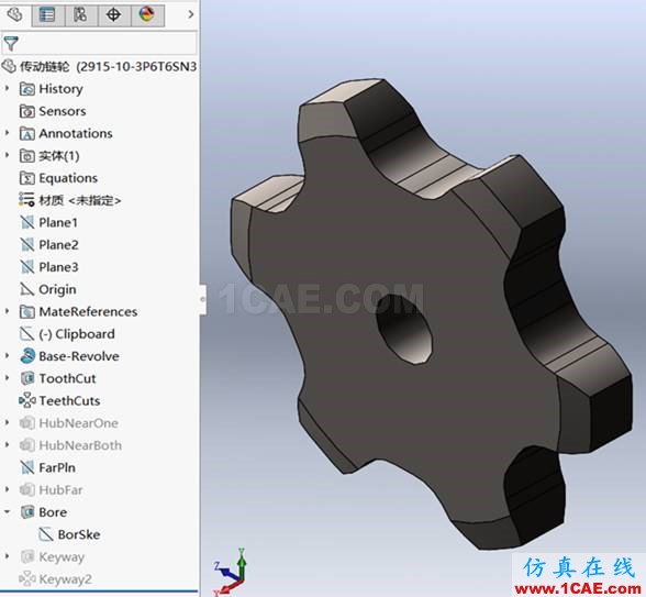 演示如何用Toolbox生成一个传送链轮:假如想要一个轴孔大小为1 inch的传送链轮,我们需要从Toolbox库中先生成传送链轮后再修改。根据自己需要的齿形和齿数生成了一个英制的传送链轮。