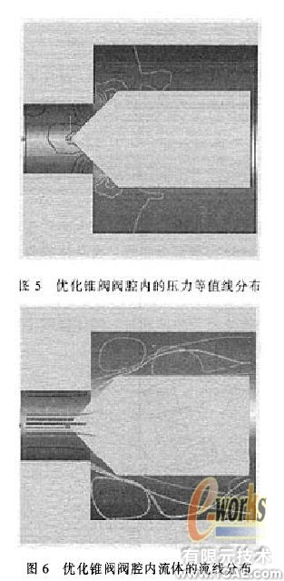 (1)通过图6和图3的对比,可以明显的看出优化锥阀通过在结构上消除漩涡2存在的区域,基本上消除了漩涡2,使流场分布相对稳定。