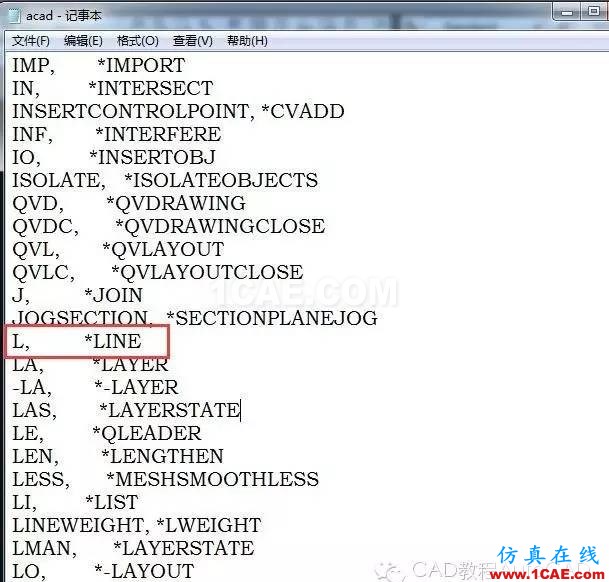 2.点击后会出现如图所示的“acad.pgp-记事本”。下拉记事本内容就看到很多快捷键,并用*隔开,还有“AutoCAD常用命令,用户可以删除或修改”。如最常见的直线命令: