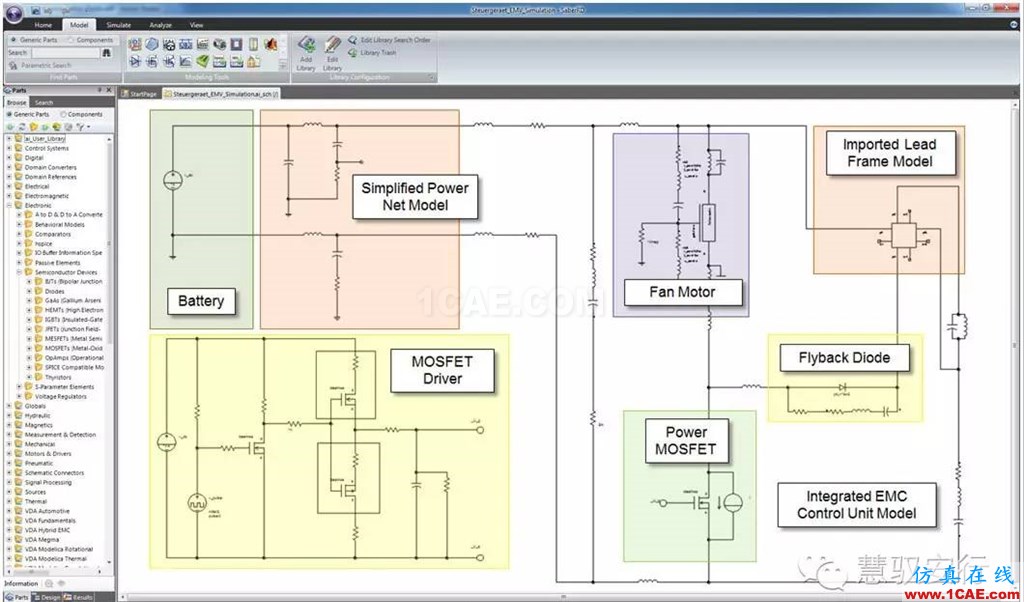 随后根据实际测量装置在Saber中建立完整的ECU系统模型,包括一个电池、一个网络模型、走线和实际控制设备。高质量的仿真需要高精确的模型,包括安装在电路板上的组件和控制设备的寄生参数。例如,精确的电容器模型需要电容器值以及寄生电阻和电感。将相同的建模精密度应用于所有其它组件,如电感、二极管或MOSFET。板级导体也用寄生电阻和电感描述。图4显示了用于Saber中EMC仿真的部份ECU系统模型。在仿真和分析飞轮电路时应特别注意。系统模型包括测试装置、MOSFET驱动器、引擎和控制设备的电源单元。导线架模型已经作为散射参数黑盒导入场解算器产生的系统模型,并连接完整于电路板上的功率半导体模型。