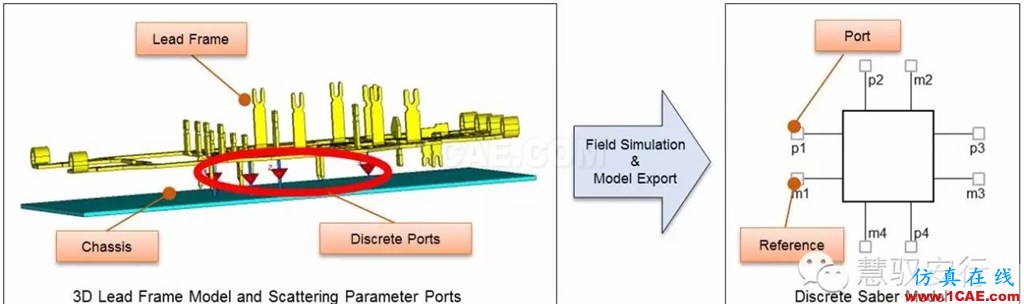 一旦定义好几何尺寸和埠后,就可以展开模型仿真了。仿真会产生电磁场数据和散射参数。图3显示了CST Studio Suite中的导线架模型和计算散射参数所需的埠。在本例中,ECU机架作为埠的参考链路。在模拟完成后,CST Studio Suit会自动导出散射参数和其它支持档案至Saber。ECU系统仿真中要求的其它组件可以重复这个过程。