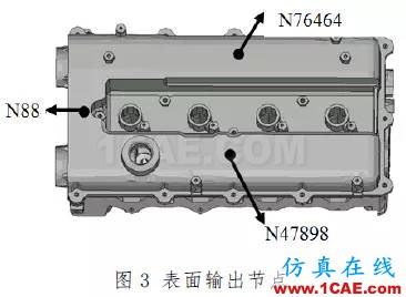 由于缸盖罩是发动机的主要辐射面,在NVH性能分析中主要关注其表面振动速度,因此读取缸盖罩上三个节点的表面振动速度,见图2.
