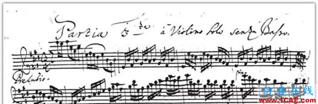 这通常被称为波形图。毫无疑问,它包含了关于这段声音的全部信息。但是同样毫无疑问的是,这些信息几乎没法从上面这个「函数」中直接看出来,事实上,它只不过是巴赫的小提琴无伴奏 Partita No.3 的序曲开头几个小节。下面是巴赫的手稿,从某种意义上说来,它也构成了对上面那段声音的一个「描述」: