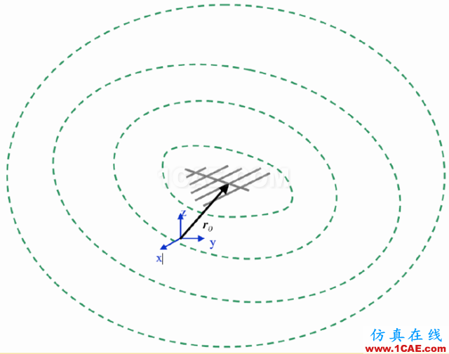 天线所辐射出的电磁波在离开天线一定的距离后,其等相位面会近似为一个球面,该球面的球心即为该天线的等效相位中心,如下图(虚线表示该天线的等相位面,在离开天线一定距离后,虚线近似为圆形(最外面一圈),其圆心即为天线的等效相位中心):