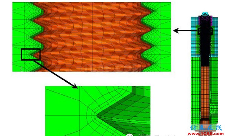 直接按照实际情况做出来螺栓螺纹采用接触分析,这样得出的结果很精确,但是这样前处理工作量大(螺栓和螺纹用六面体网格建模)、计算量大(接触收敛困难),如图为某结构带螺纹螺栓和连接件模型(图1)和计算得出的结果(图2):