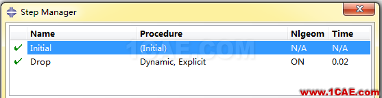 在step模块中定义dynamic,explicit分析步,命名为Drop,将时间长度设置为0.02s,接受默认的历史和场变量输出要求。