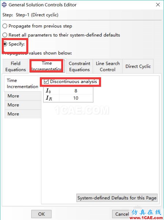 为了改善结果的收敛,可以在other选项中,general solution control中edit一下step-1,进入编辑界面,如图设置。在下图中time incrementation下一个选项more中的IA数值改为50.