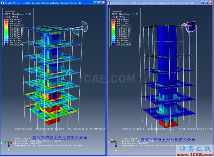 图2左边为隐式下12s的混凝土受压损伤,图2右边为显式下12s的混凝土受压损伤;