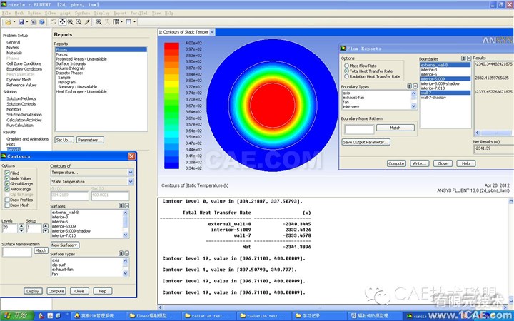 Pra=5.67e-8*1*3.14*1*(400^4-335^)=2315W,和fluentreprot值2333W(包含了空气热传导的功率)比较接近;