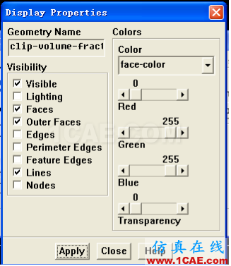 2.将clip-volume0fraction-13设置为水蓝色:Scene Discription窗口中在Names一栏中选择clip-volume0fraction-13,然后点击Display。在弹出的Display Properties窗口中,按图10所示设置。