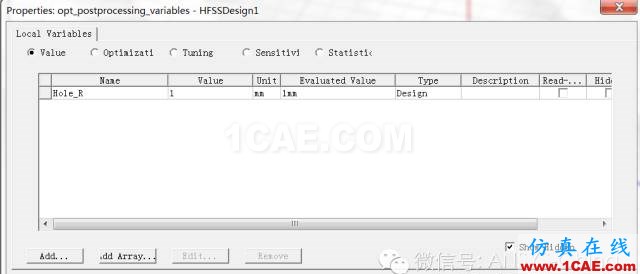 Design变量通过HFSS菜单栏HFSS Design Propertities Add的方法定义,Design变量属于局部变量(Local Variables),其仅在当前HFSS设计中有效,不能使用于相同HFSS Project的其他设计中。