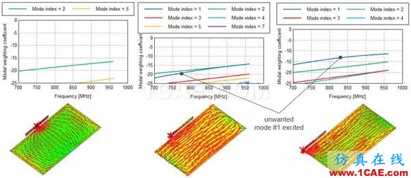 由图12可以看出:Mode #1 和#2 电流分布沿着PCB宽边和窄边;mode #3 电流沿着PCB四周环形,Mode 1 和2 非常适合MIMO的分集策略,Mode #3 MS值很低,因此在此频段很难激励。