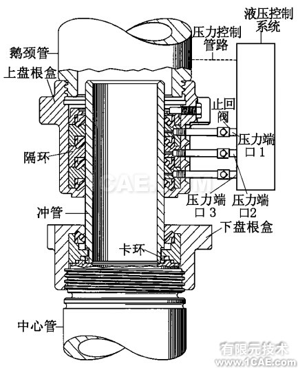 石油钻井中的水龙头上部通过鹅颈管与水龙带、泥浆泵相连接,下部连接旋转中心管,向旋转着的钻柱内引输高压钻井液。水龙头盘根旋转动密封是水龙头设计的关键环节,密封介质为高压、磨砺性强的钻井液,盘根密封是转与不转的动密封。尤其是在高压下,钻井液盘根密封系统是水龙头的最薄弱环节,其密封性能直接影响水龙头的寿命和钻井速度。