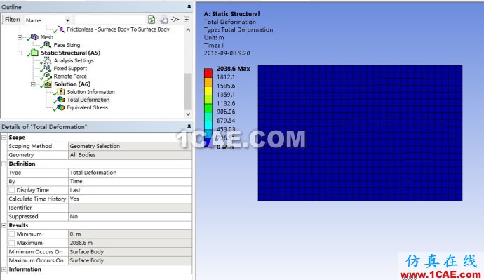 (13)求解完成后查看后处理,查看变形和应力,这时我们发现,虽然可以求解完成,但是半圆形刚性体的位移为2038.6m,产生了刚性位移,也就是说,半圆和长方形并没有接触上。接着将需要修改接触设置,先修改接触表面类型,设置为Adjust to touch,也就是允许调整模型的间隙到刚刚接触,然后再次进行计算。