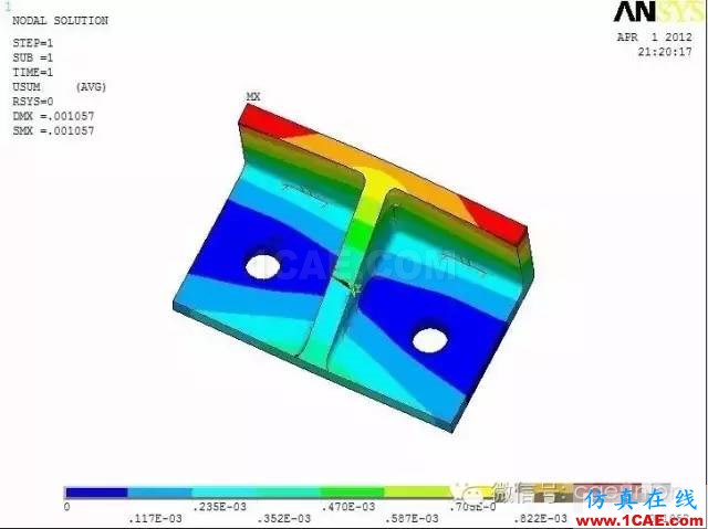 由图5可以看出:最大的应力为3.21MPa,只要该应力小于材料的许用应力,材料就不会失效;从图中可以发现,在两个小孔中应力图为红色,就是说这里的应力最大!这就是我们常见的应力集中现象。应力集中是工程中零件破坏的主要原因,在工程中应尽量避免应力集中现象的发生,我们可以通过倒角、热处理等措施来改善应力集中的现象。