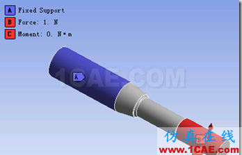 一根变截面轴,左边轴段(蓝色部分)固定,而在最右边轴段上(红色部分)施加一个1N的集中力(它导致弯曲变形)和一个1000Nmm的集中力偶(它导致扭转变形)