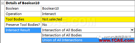 Intersect Result 中有两个选项Intersection ofAll Bodies 和Union of All intersections,如下图9示。Union of All Intersections是对所有交集组合在一起的。而Intersection ofAll Bodies就是对所有实体取交集。该选项涉及到多个相交运算,本例不便演示。贴张图片来演示下,相信你对Intersection ofAll Bodies 和Union of All Intersections的区别很容易就明白了,如图10。