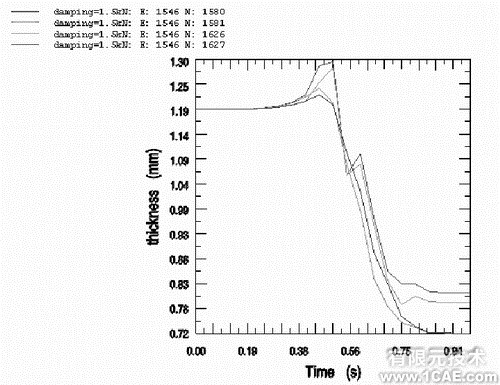 本实例模拟油箱的冲压成型过程。图3所示为实际成型时油箱的一半的形状。考虑到在冲压成型过程中,油箱结构的对称性,本文通过模拟图3左下所示的结构,对其进行模拟分析,达到分析整个油箱成型的目的。首先,通过ABAQUS/CAE完成图3右侧所示的装配图,其中平面铝板将被冲压成型为图3左下的结构。成形的全过程如图4所示,模拟结果跟实际生产过程相吻合。其中,图5所示为整个过程中内能和动能的变化曲线,可以确定模拟过程为准静态。图6表现的是成型后金属板的厚度分布云图。图7给出了与厚度变化最大处的单元相关的四个节点处的厚度在时间域内的变化曲线。