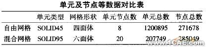 采用自由网格划分和混合网格划分得到的单元及节点等相关数据,列表对比如下 从上表的数据中可以看出:自由网格划分单元数目比混合网格划分单元多近100万个,且单元为四面体;单元阶次也比混合分网要低,其单元质量比混合网格(六面体)划分要差。