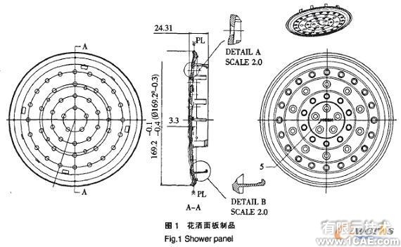 卫浴花洒面板如图1所示.材料为ABS,重量71 g.该产品呈盘形状,直径大,制品壁厚小且不均匀,表面均布细孔,外表面中心有凸字,内表面有内扣、定位筋.产品将与半球形本体配合,边缘圆周平面度要求高;为保证出水均匀,对水孔的圆度及位置度,提出了很高的要求;外观要求不能有缩孔、熔接痕、脱模痕,不能有划伤、变形、飞边;保持塑件外表面光整,达到公司A级标准,供电镀.