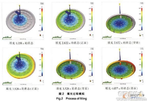 塑料填充过程如图2所示.从中可看出,从正面近中心直接进胶,熔体均匀向四周流动,填充进展顺利.由于未从正中心进胶,造成进胶有点不平衡(相差0.7 s左右),但仍处于可接受范围之内.