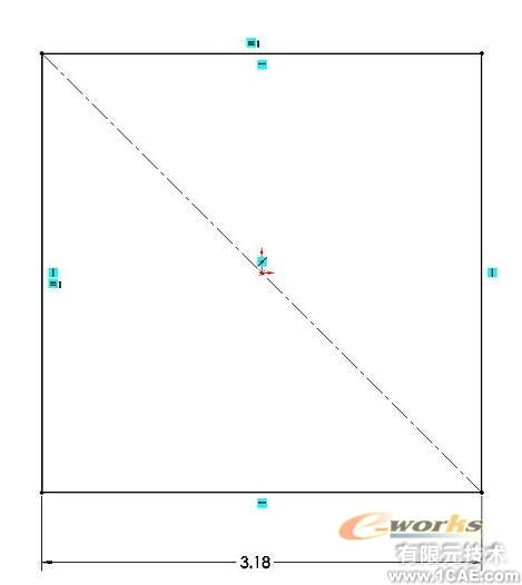 矩形草图工具用于创建 VEX 轴的轮廓。在机器人设计中,您会希望零件具有对称性。原点代表前基准面、上基准面和右基准面的交点。简单的矩形草图可从原点开始绘制,但是,如果您将原点置于草图中心,则草图将保持关于上基准面和右基准面对称。在矩形的两个顶点间连接一条辅助线,并在原点和该中心线间建立中点关系,将可确保矩形始终对称。