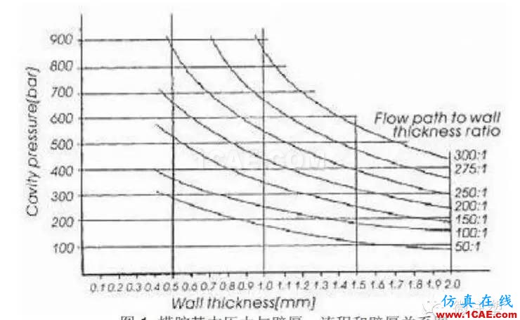 3.1.2 模腔压力决定于壁厚、流程与壁厚的比例及粘度等级常数(K) 模腔基本压力(P0)决定于壁厚、流程与壁厚的比例(如图)。