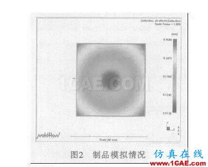 采用图1所示的制品和表1中的工艺条件, 应用MoldFlow软件的“Flow+Warp”功能模拟制品收缩的情况, 如图2所示, 图2中显示为用PP 塑料, 厚度为1.4mm制品的翘曲情况。