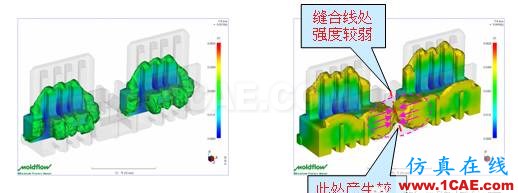 MPI/3D流动模拟的结果, 如图4所示, 双浇口形成的两股料流, 在中间连接区域大块的肉厚处相遇, 形成缝合线. 在缝合线处强度较弱, 并在此处产生较大的收缩.